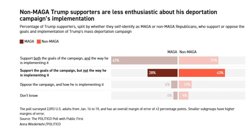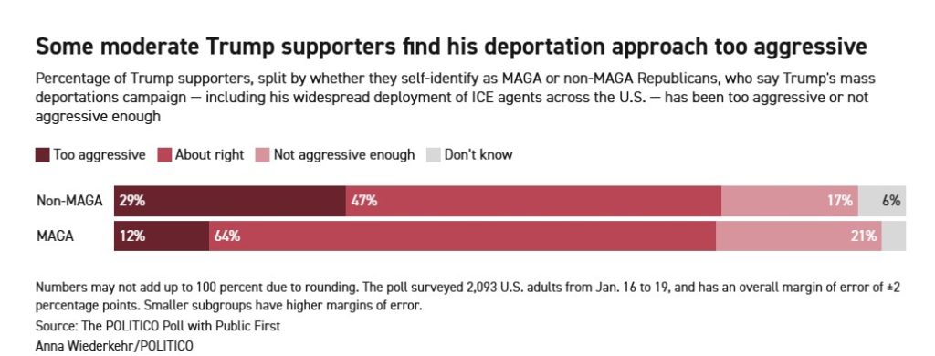 Overall, most Trump voters still support the deportation campaign. Fifty-five percent say the actions are “about right,” according to the POLITICO Poll with Public First. But there is a clear divide within his coalition. Among Trump voters who do not identify as MAGA, 29 percent say the campaign is too aggressive, and 43 percent say they support the goals but not the implementation.